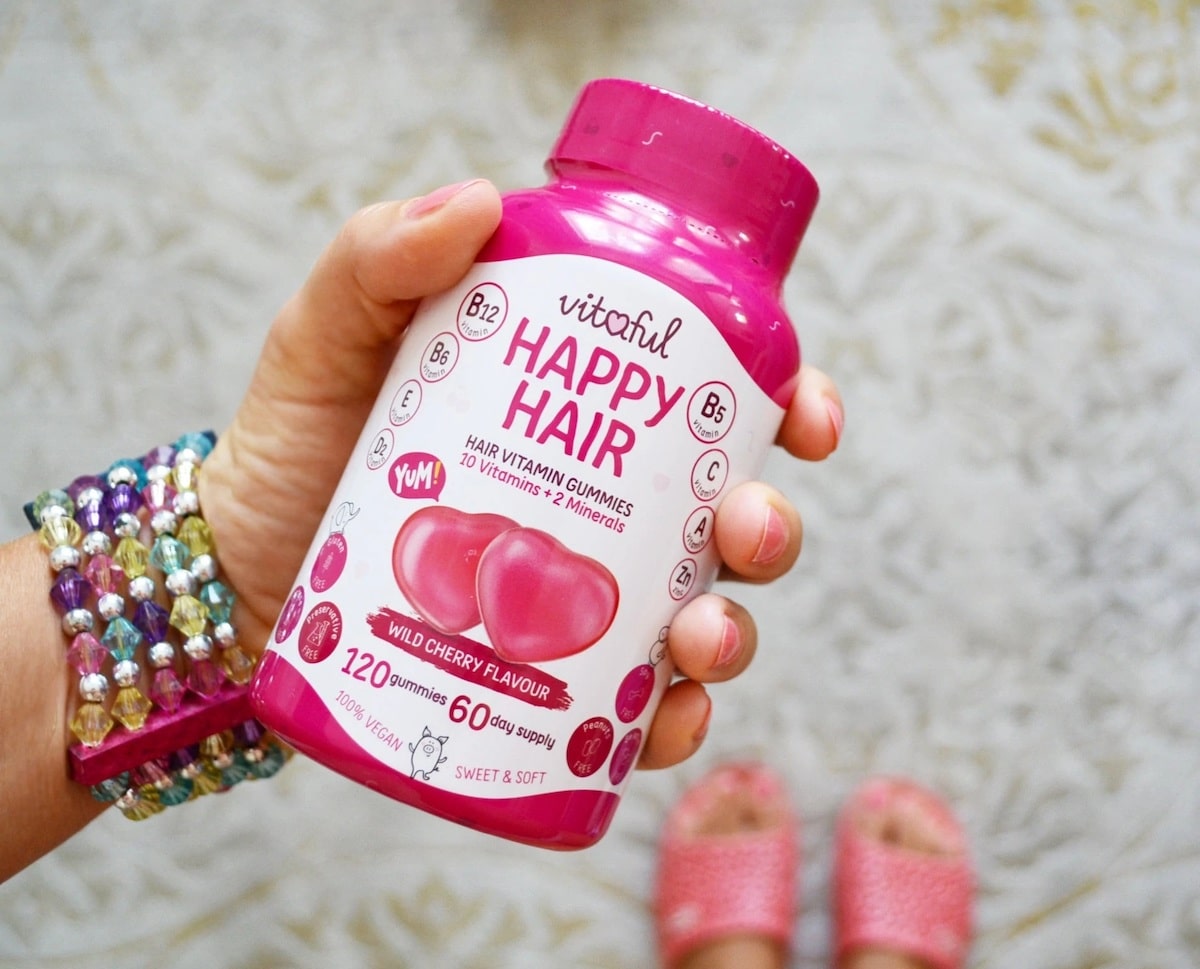 Happy Hair sunt jeleuri gumate, în formă de inimă, cu aromă de cireșe sălbatice, cu absorbție rapidă, care conțin vitaminele A, B, C, E și D, biotină, zinc și acid folic.